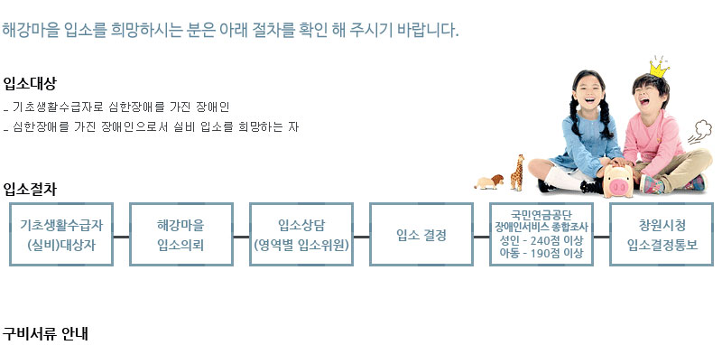 주민등록증, 복지카드, 사진3매, 도장, 주민등록등본, 건강진단서(X-RAY 결핵여부, 간염 항원항체 표시, 혈액형) 기초수급자 확인서류(수급자 증명서), 투약할 경우 - 의사소견서, 약처방전 |