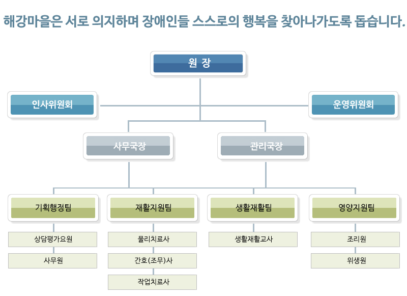 | 구분 | 원장 | 사무국장 | 간호사 | 영양사 | 사회재활교사 | 상담 평가요원 | 물리치료사 | 생활재활교사 | 조리원 | 위생원 | 촉탁의사 | 작업치료사 | 언어치료사 | 사무원 | 계 |